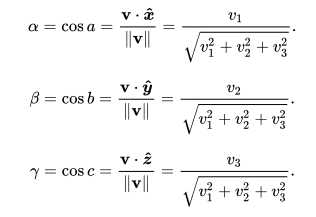 在解析几何里,一个向量的三个方向余弦分别是这向量与三个坐标轴之间的角度的余弦。假设是三维空间里的向量: